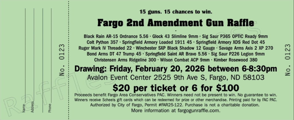 The raffle culminates with the “Liberty & Justice For All” dinner and speaker event on Friday, February 20th, 2026 at The Avalon Event Center here in Fargo. The Fargo Area Conservatives will be announcing their dynamic keynote speaker later this month! We look forward to seeing you there!