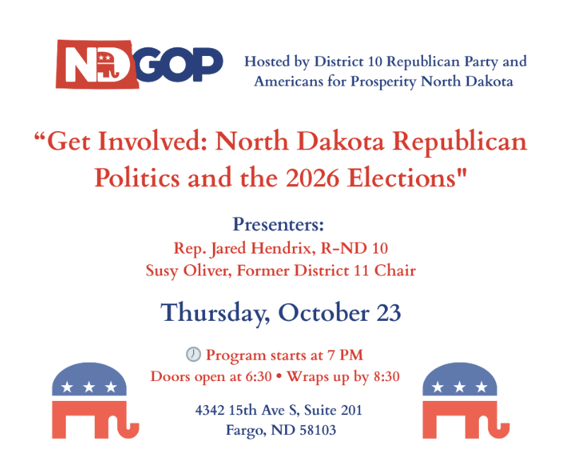 North Dakota’s 2026 elections start now. Join local conservatives for a hands-on look at how to get involved and make your voice count. Oct 23 · Fargo · 7 PM Doors open at 6:30 PM Program starts at 7 PM and wraps up by 8:30 PM RSVP encouraged → https://forms.gle/hCC5hZG7QWvFM1oy6 Location: Americans for Prosperity North Dakota 4342 15th Ave S, Suite 201 Fargo, North Dakota 58103 United States |