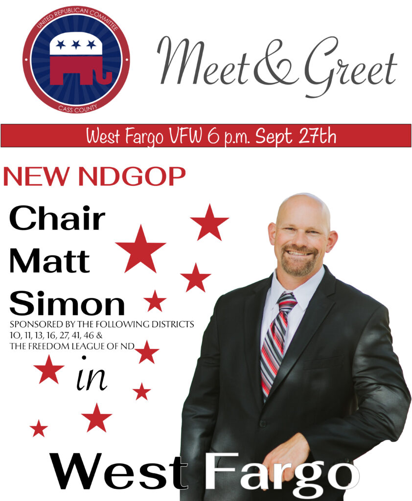 Join us for a meet and greet at the West Fargo VFW. The new Chairman will share his vision for the party. Free Will Donation at the door to benefit the United Republicans of Cass County. For more information please contact NDGOP D16 Chair at ndgopd16@protonmail.me. |